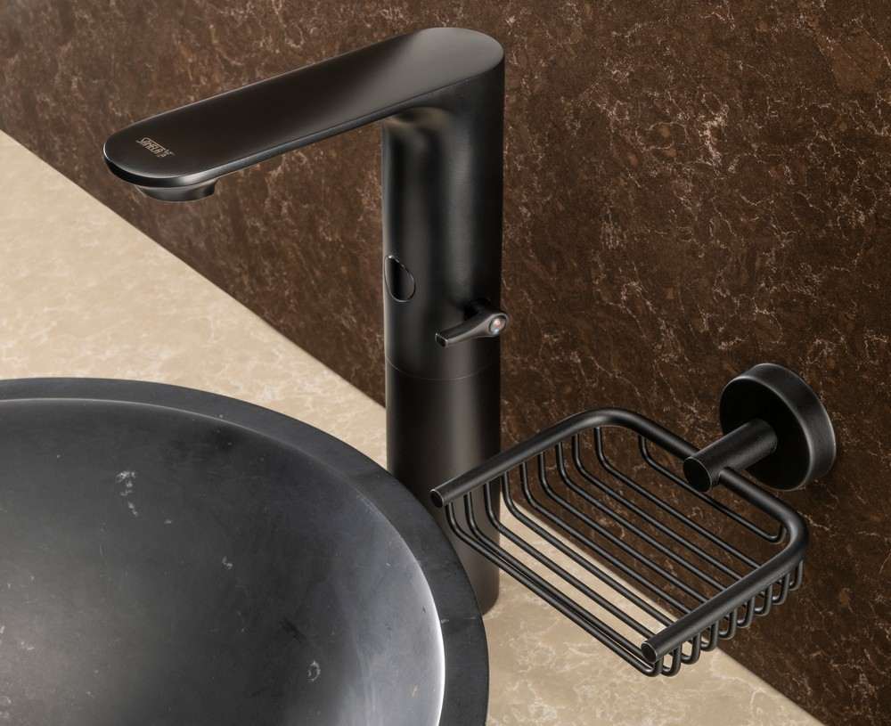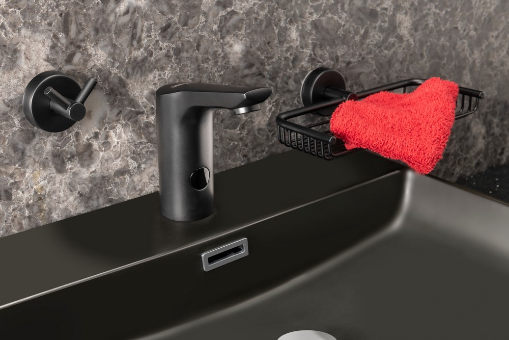 Sort virker ikke kun stilfuldt og elegant, men er også praktisk i forhold til vedligeholdelse. Takket være sensoren, som er en del af armaturet, undgås unødvendigt vandspild. Så snart sensoren registrerer en hånd, starter vandet, og efter vask slukker det straks igen. Armaturerne er desuden udstyret med en vandbesparende perlator.