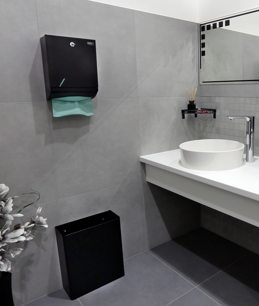 Nu kan du købe og forskønne dit projekt med den sorte affaldsspand SLZN 23V, toiletpapirholderen SLZN 37V og papirhåndklæde-dispenseren SLZN 20V. Alt er fremstillet af rustfrit stål i høj kvalitet.