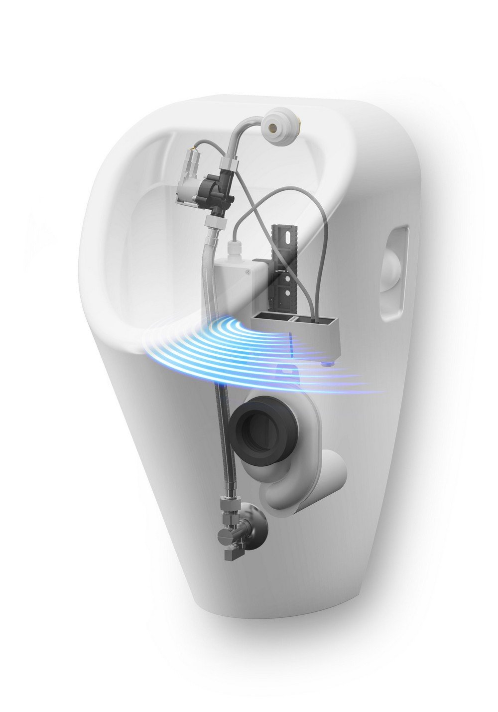 SLP 19RZ - Supply No. 01195 - ceramic urinal with radar flushing unit on the mounting rail, electromagnetic valve, connecting hoses, angle valve with filter and check valve, inlet fitting with a rubber sealing, siphon, mounting set, paper drill template, power supply