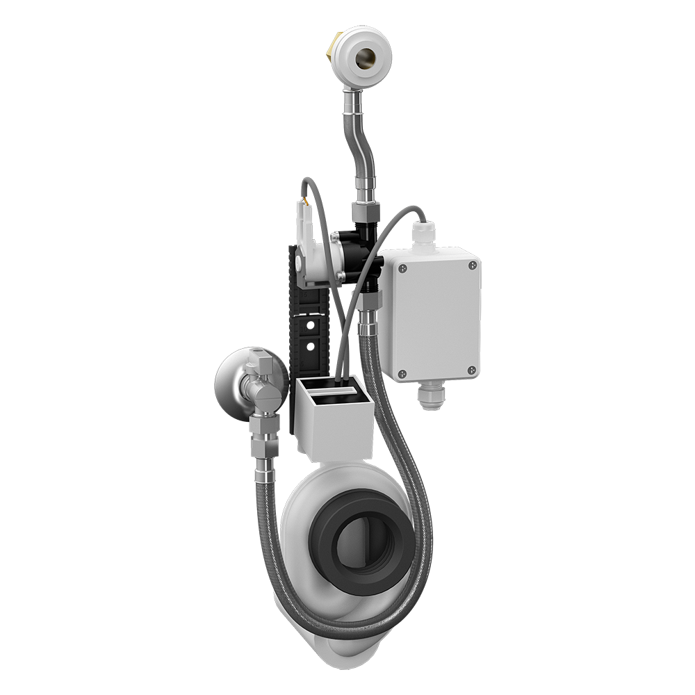 SLP 70RZ - Leveringsnr. 11706 - radarskylleenhed inkl. Bluetooth-modul på monteringsskinnen, elektromagnetisk ventil, silikoneprop (2 stk.), tilslutningsslanger, vinkelventil med filter og kontraventil, indløbsfitting med gummipakning, vandlås, bore-skabelon i papir, strømforsyning