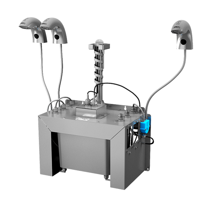 SLU 45M3 - Leveringsnr. 03454 - armatur med elektronik (3 stk.), tilslutningsslanger, elektromagnetisk ventil (3 stk.), central sæbedispenser med peristaltiske pumper til flydende sæbe og sæbebeholder 6 l, strømforsyning SLZ 01Y, fjernbetjening SLD 03