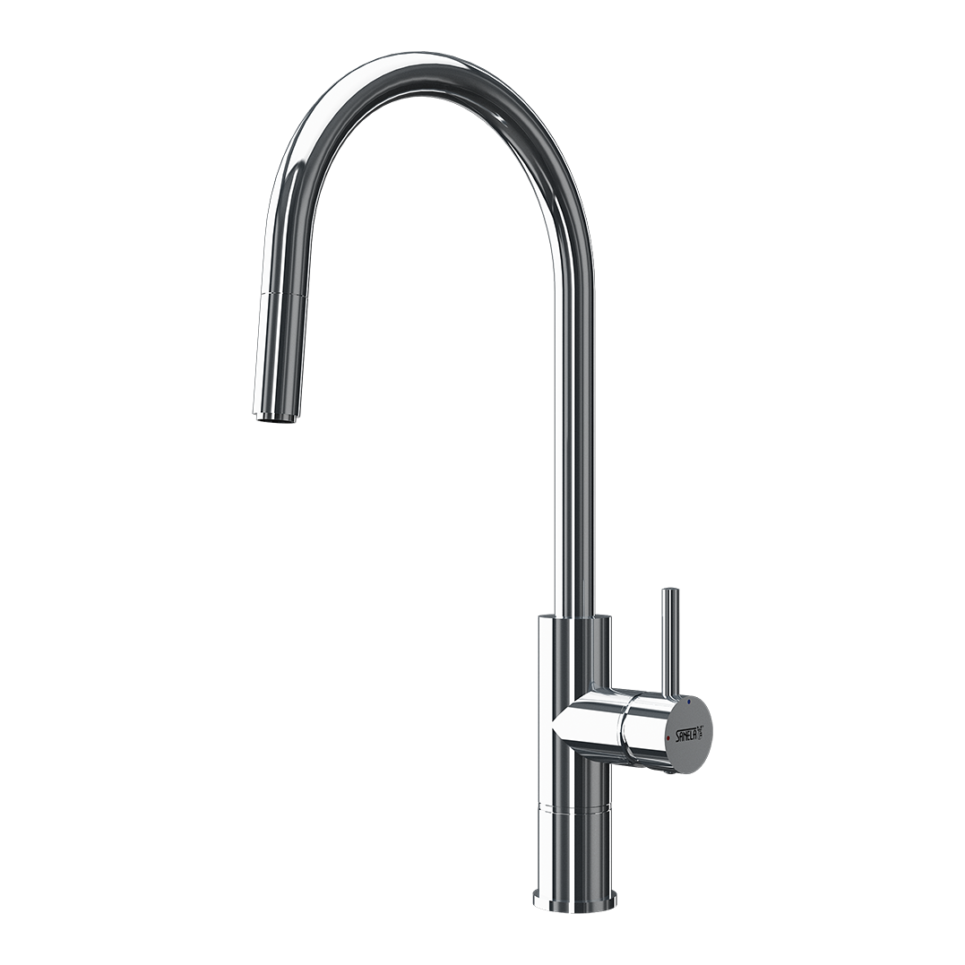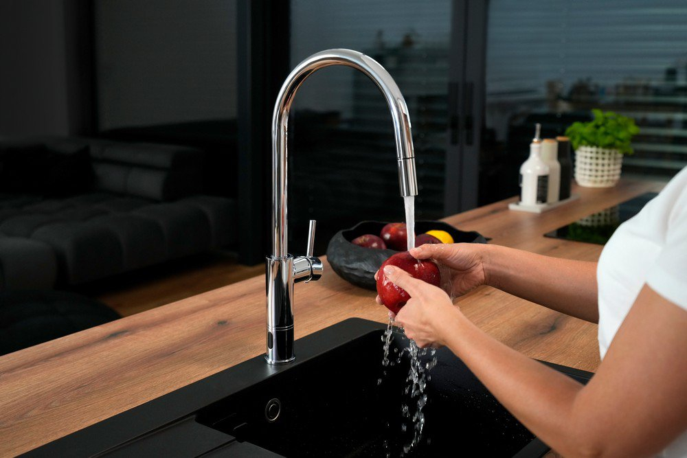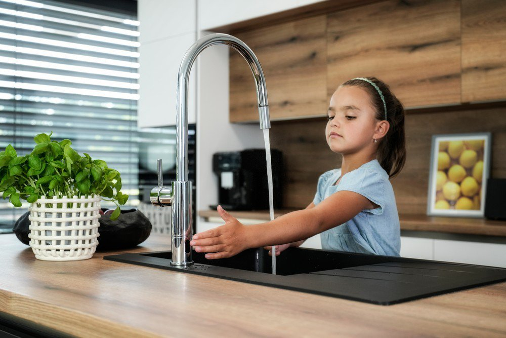 - reagerer på tilstedeværelsen af en hånd i sensorzonen ved straks at starte vandet