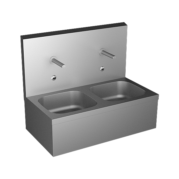 - Væghængt dobbeltvask i rustfrit stål med bagvæg og integreret infrarød elektronik
