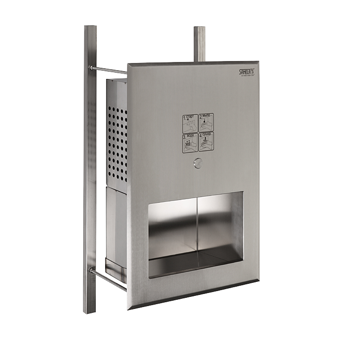 - indbygget håndvask i rustfrit stål med integreret piezoelektronik til sæbedispenser, vandudløb og håndtørrer i én