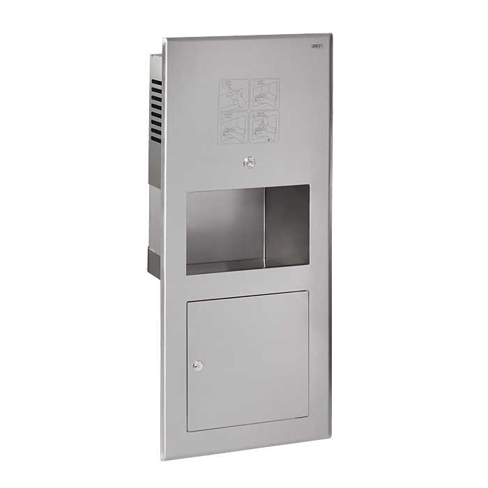 - indbygget håndvask i rustfrit stål med integreret piezoelektronik til sæbedispenser, vandudløb og håndtørrer i én