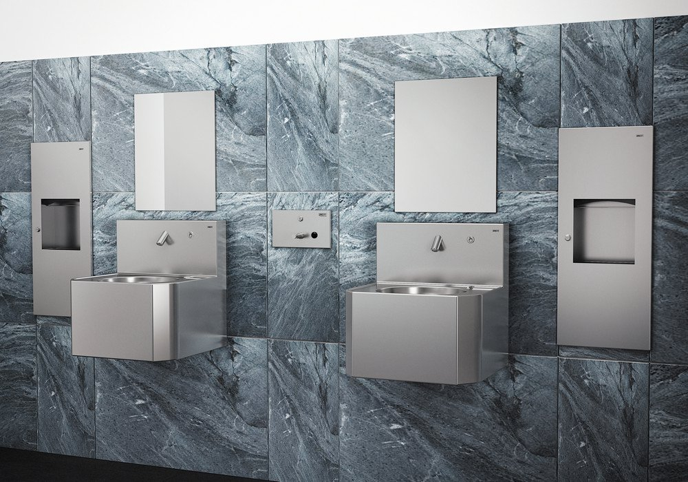 - vægophængt håndvask i rustfrit stål med piezoelektronik og speciel anti-selvmords tud
