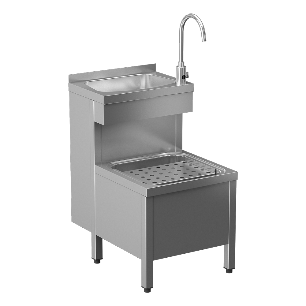 - fritstående kombineret rengøringsvask i rustfrit stål med håndvask, rist og automatisk armatur SLU 08LND (drejelig hane, START/STOP-program)