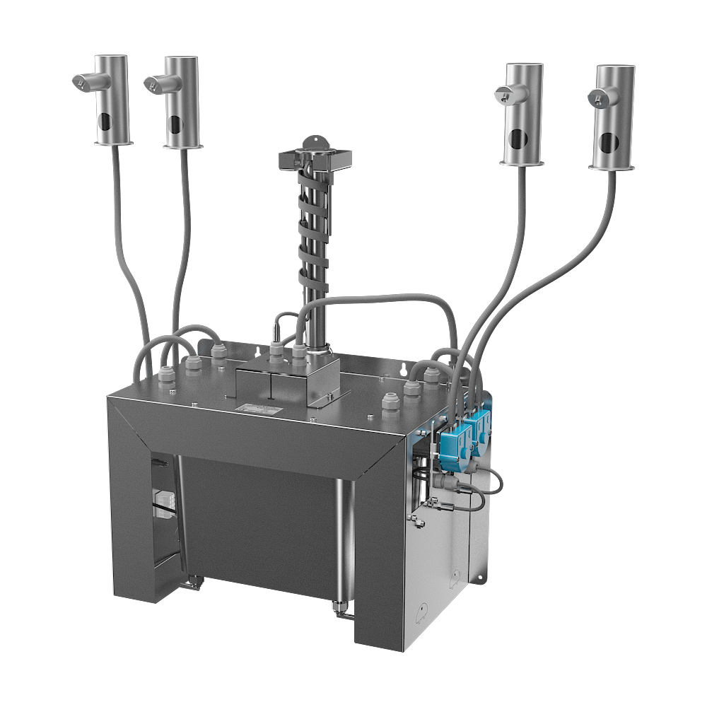 SLZN 91E4 - Leveringsnr. 85914 - tud i rustfrit stål med elektronik (4 stk.), indløbsslanger, central sæbedispenser med peristaltiske pumper til flydende sæbe og sæbebeholder 6 l, strømforsyning SLZ 01Y, fjernbetjening SLD 03